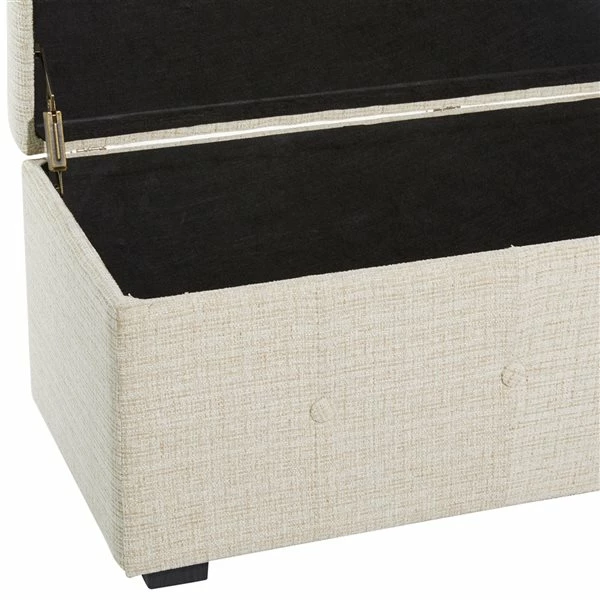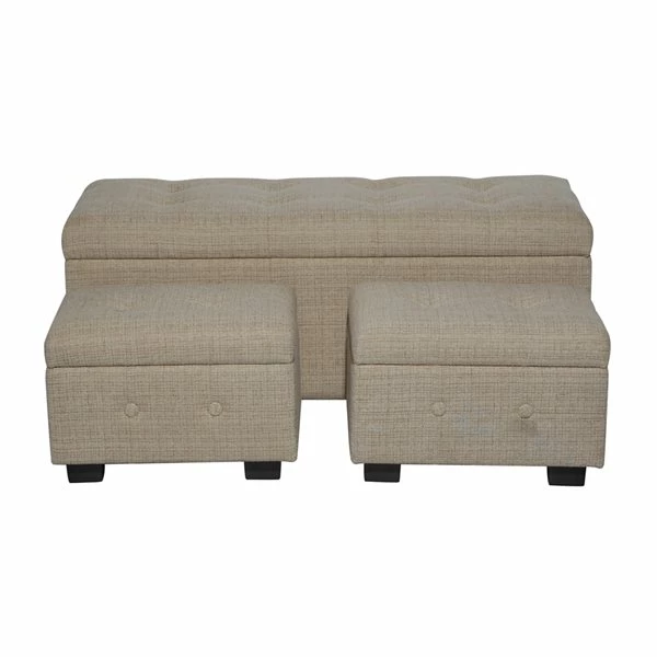 - This indoor storage bench set has beige coloured fabric for traditional style