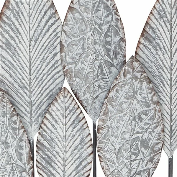 - Features a greyscale leaf design etched in iron displayed inside the frame of thin and long metal sticks