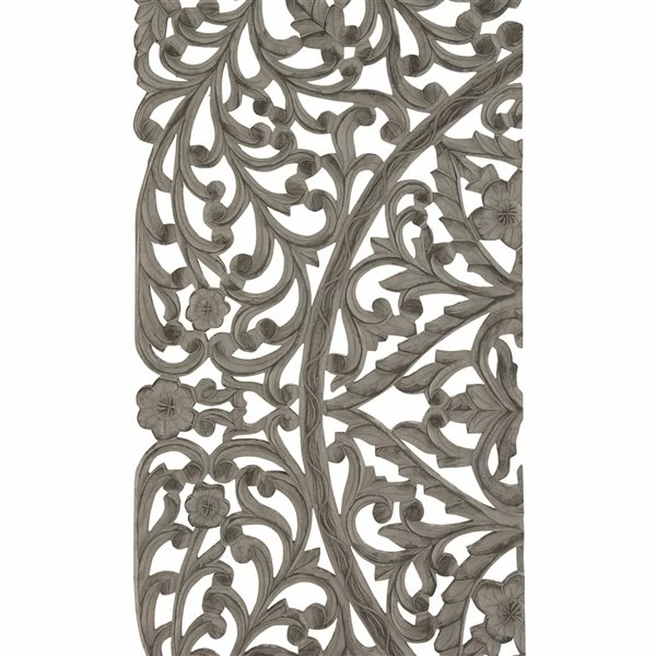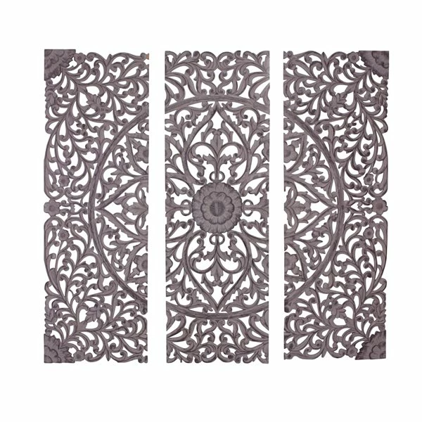 - Features elegant carved patterns of scrolling and circular themes spread over a 3-piece panel set