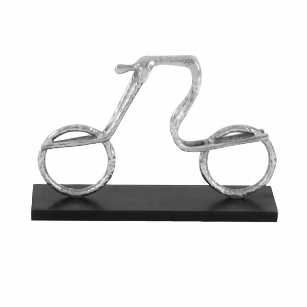 - Metal bicycle sculpture table decor with polished metallic silver abstract bicycle with dark wood rectangle base