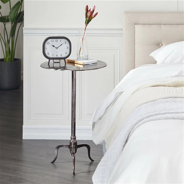 - The round metal accent table has a sleek silver finish that suits a contemporary space