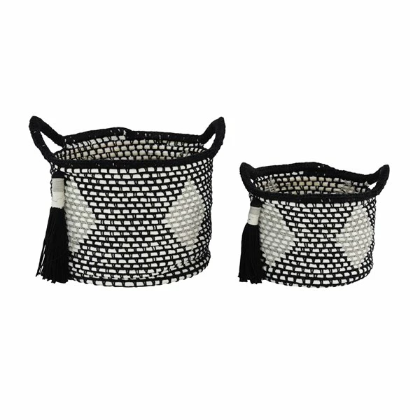- Each woven storage basket features white diamond side patterns with one large tassel on one side for additional style and character