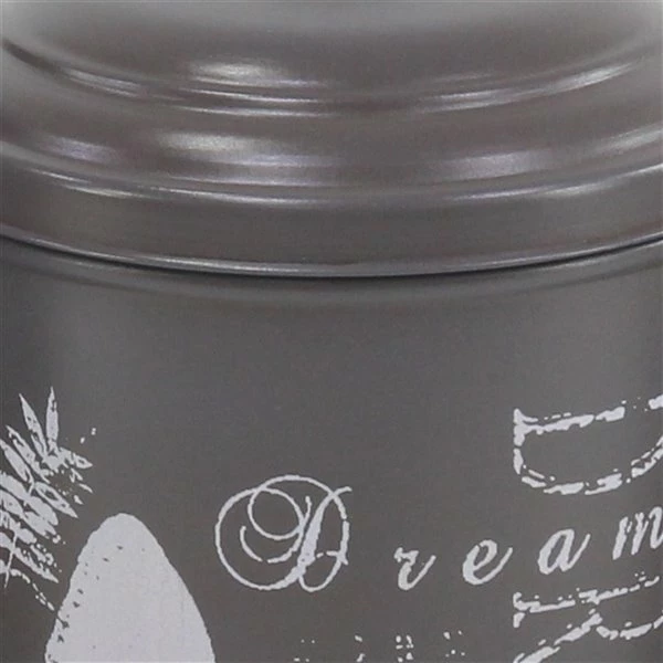 - This vintage style inspired design grey tin canister set features a cylindrical body ornamented by distressed white paint of typography and images furnished with a shallow dome lid