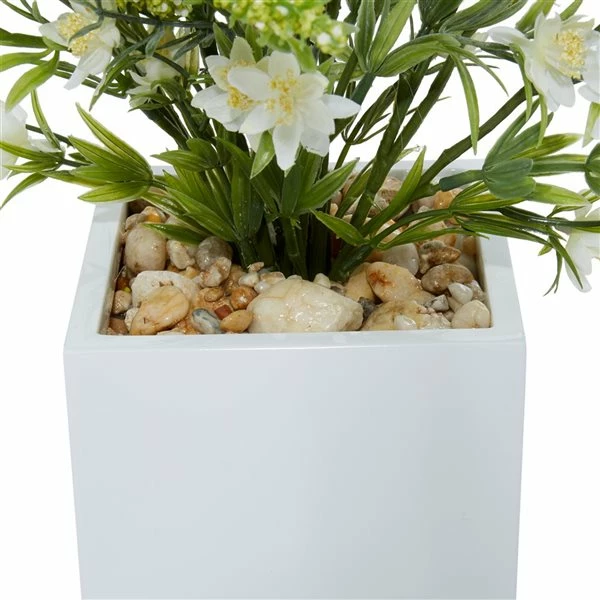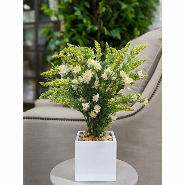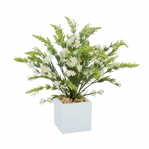 - Faux wild white heather with natural rock filler and opulent vase