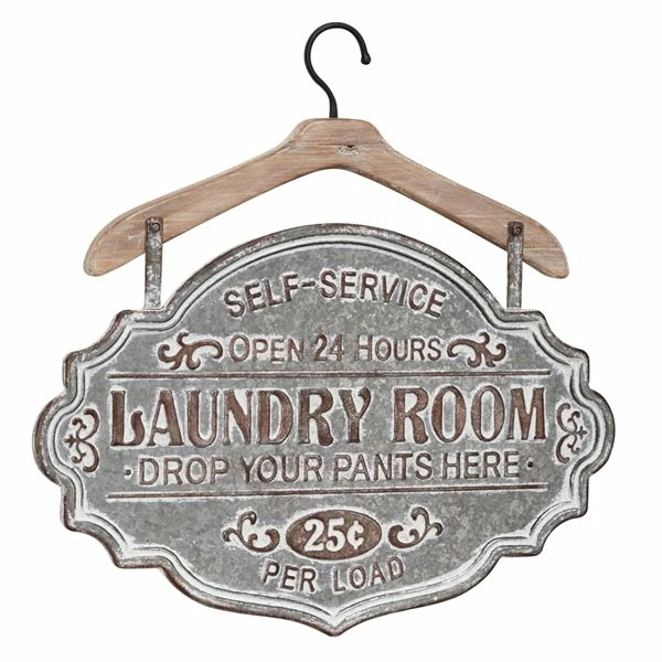 - Features a decorative galvanized metal sign on a whitewashed hanger