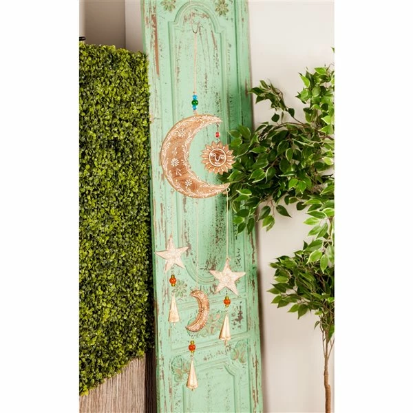 - Features dangling moons, stars, and a sun attached with chimes for a melodious vibe in a soft breeze