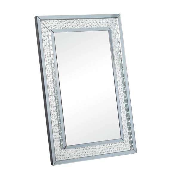 - Features reflective glass finish and a silver polished ceramic mirror frame with acrylic crystal embellishments