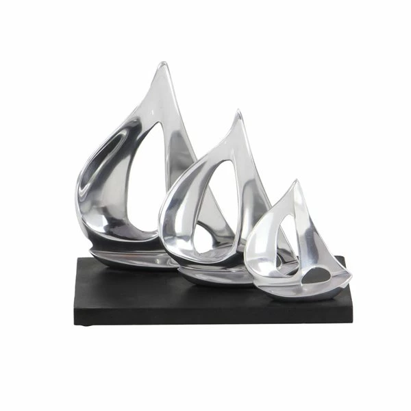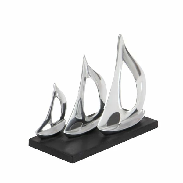 - Metal sailboat sculptures table decor, polished metallic silver sailboats with dark wood rectangle base
