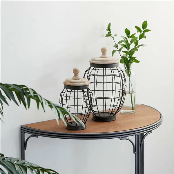 - This farmhouse style metal and wood jar set comes in a black metal body with a brown wood lid