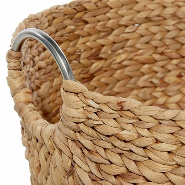 - This 3-piece woven storage basket set features braided and interlocked plant fibres forming cylinder receptacles with loop handles