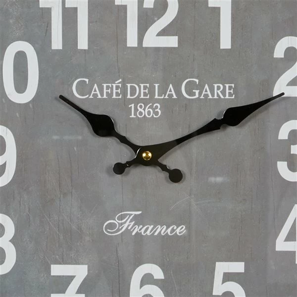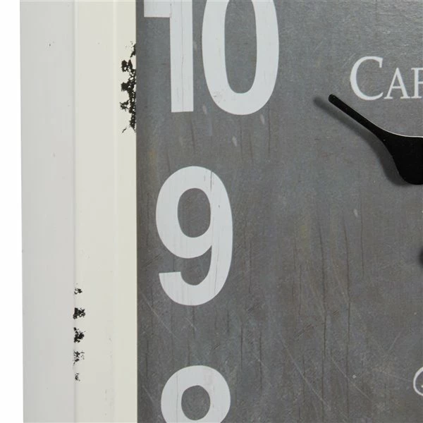 - Distressed white housing, grey clock face with large white numerals and elegant script
