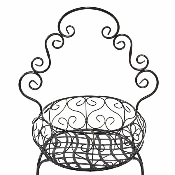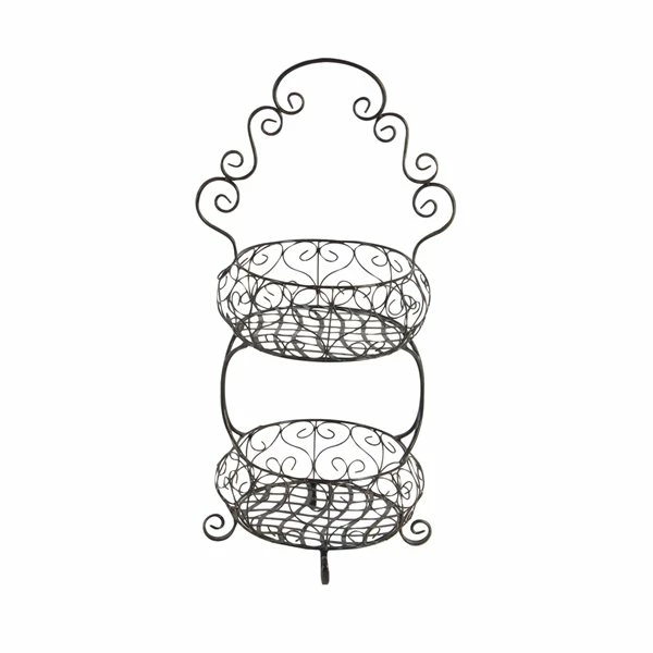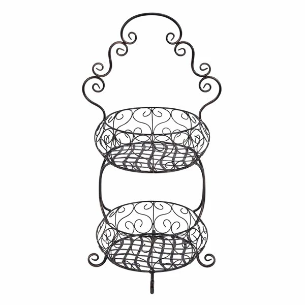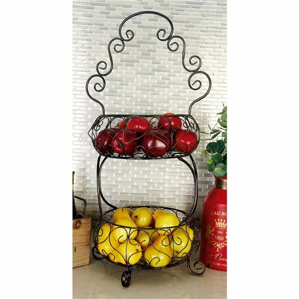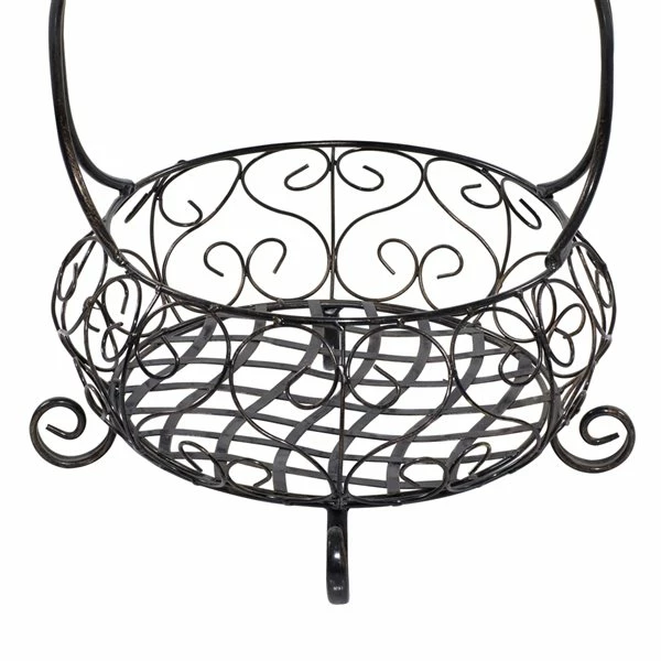 - 2-Tier basket stand with a handle and feet designed with iron scrollwork