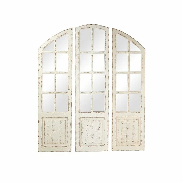 - Features a 3-panel mirror with vintage style arched silhouette, window frame interior with glass mirrors, and decorative carved wood bases