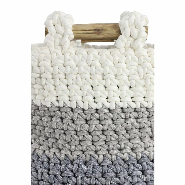 - These baskets are handmade from cotton ropes covered in clear, grey and navy blue mesh, intricately woven into rows of braids, creating a striped pattern
