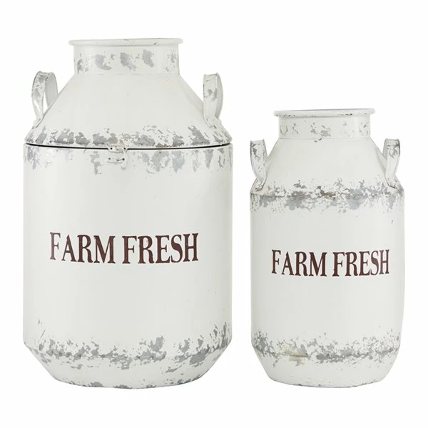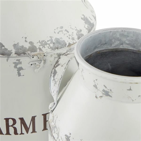 - This farmhouse style inspired design white iron milk can set features a distressed white finish on connecting segments to the cylindrical body furnished with 2 curved handles