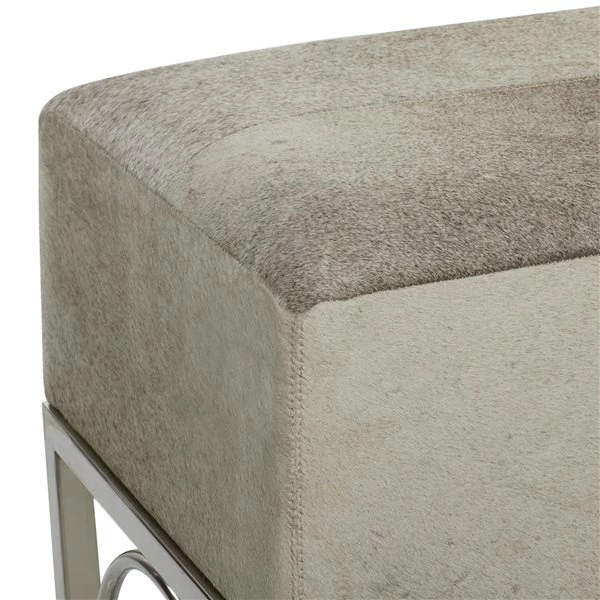 - Seating bench built on a lightweight, frame with MDF board seat wrapped in white and grey cowhide made from stitched square patches