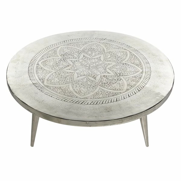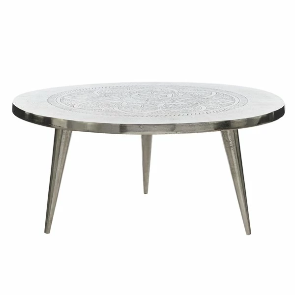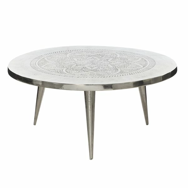 - This traditional style inspired silver aluminum round coffee table features a large elaborate flower design on the surface with a round design and 4 round legs