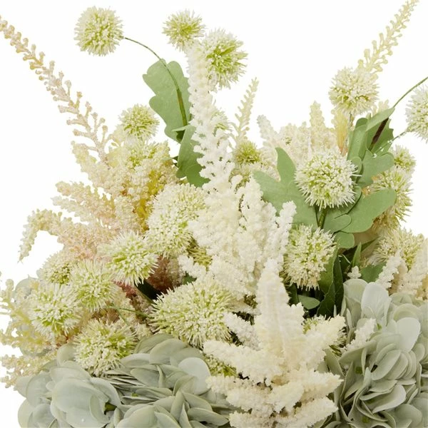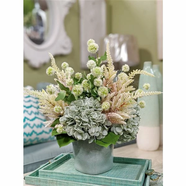 - Faux flower arrangement featuring white snowballs, teal hydrangea, and white astilbe