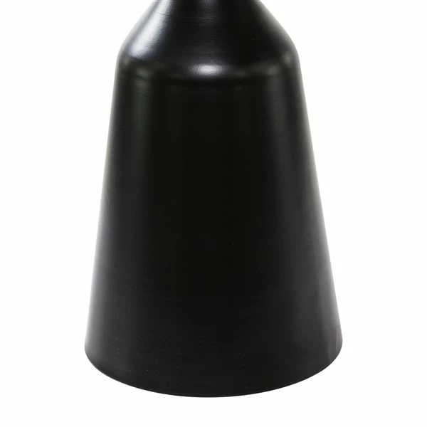 - Features a round tabletop balancing on an inverted trumpet-shaped leg