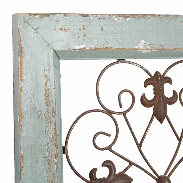 - The bronze-coloured iron complements the pale green distressed wood