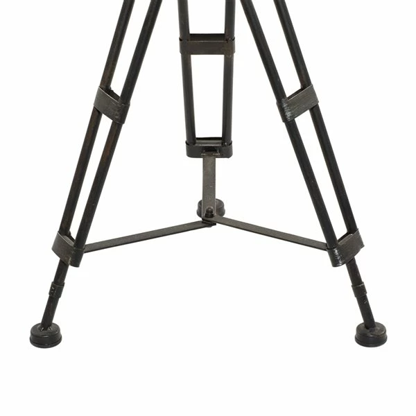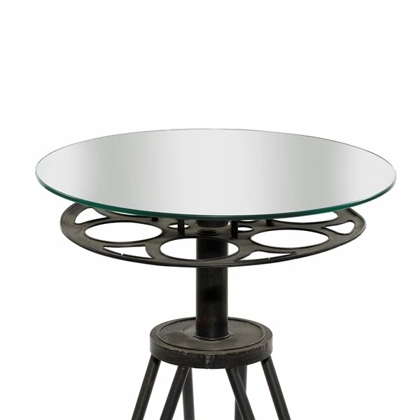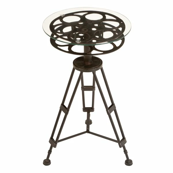 - This movie reel accent table highlights a black metal finish topped with faintly tinted glass