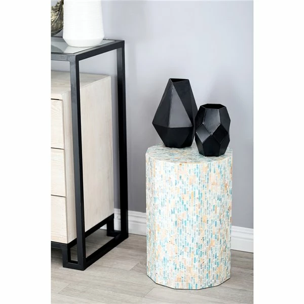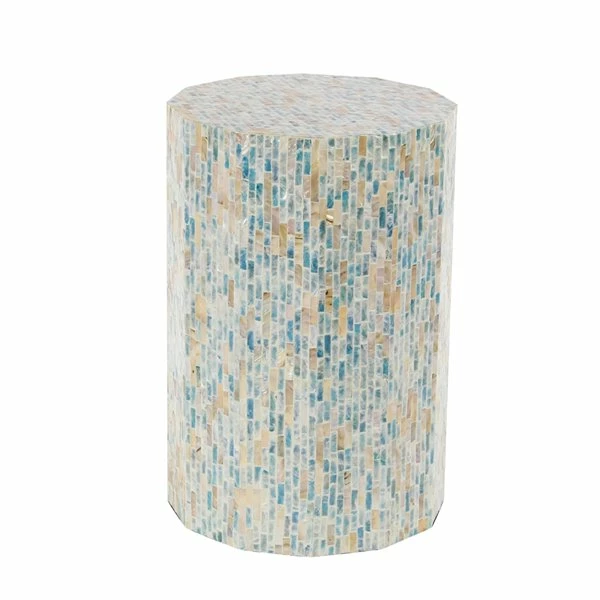 - This drum accent table highlights a shell inlay mosaic pattern that results in a pastel-toned finish