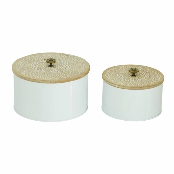 - Solid white tins with birch-coloured lids with engraved mandala designs, features decorative cared wood tops