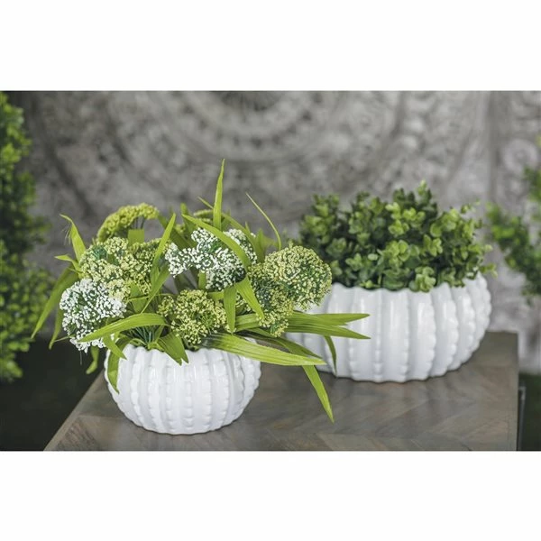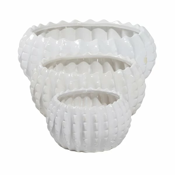 - Monochrome glossy white planters with round gourd shapes and textural vertical ridging around each body and wide planter mouth