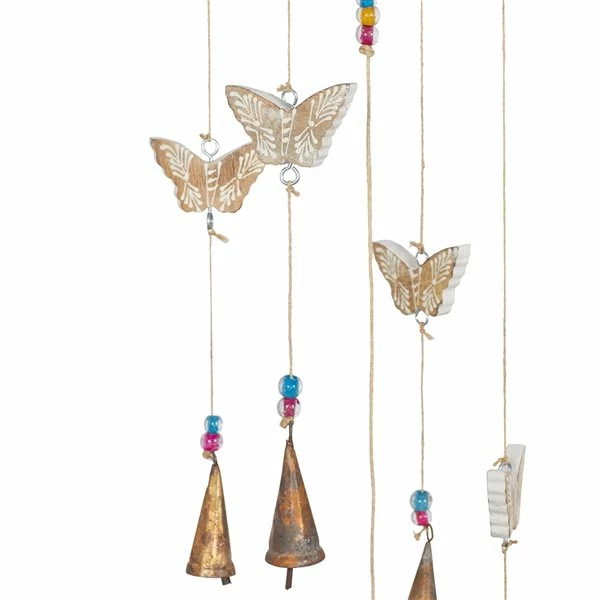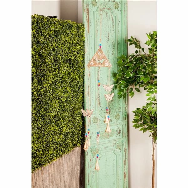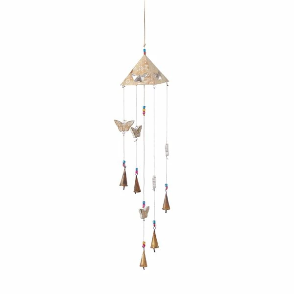- Designed with butterfly figures in gold finish, and gold cone-shaped wind catchers and multicoloured glass bead accents