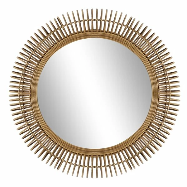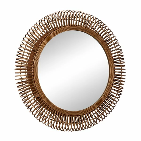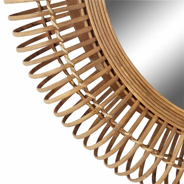- Beachy natural rattan bands around the round mirror inlay and looped rattan forming a radial striped pattern on the outside of the frame