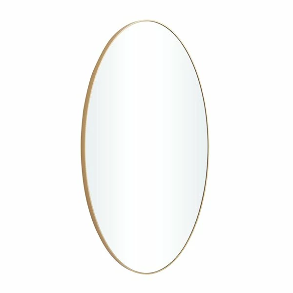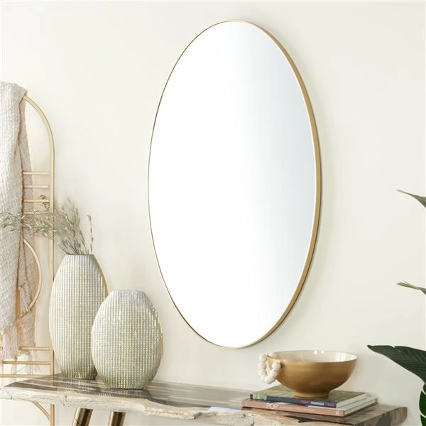 - Features an oval-shaped reflective glass and a thin gold wooden frame