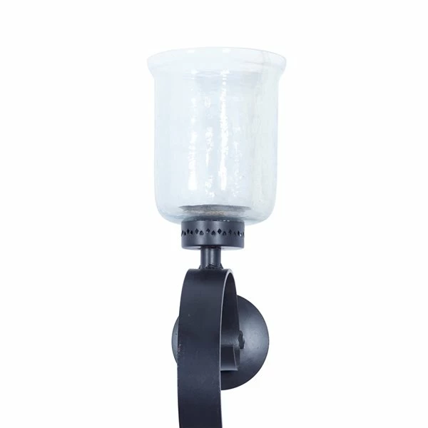 - Metal wall sconce crafted from iron with a clear glass candle holder