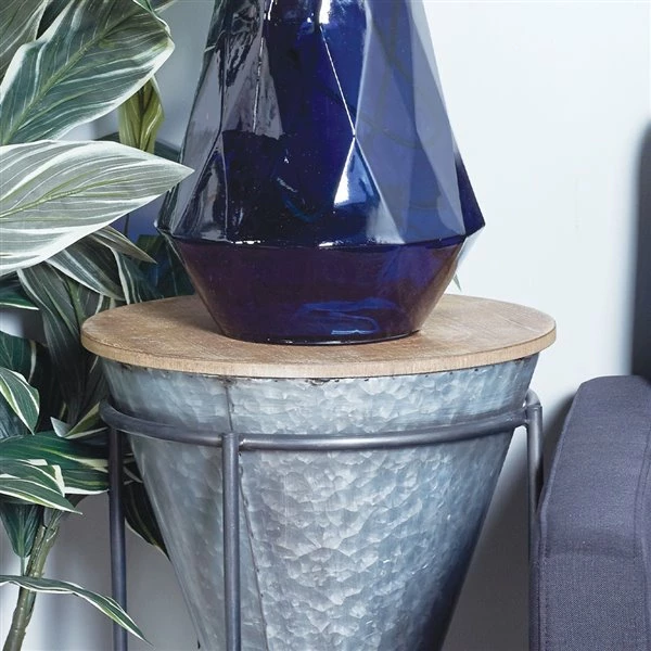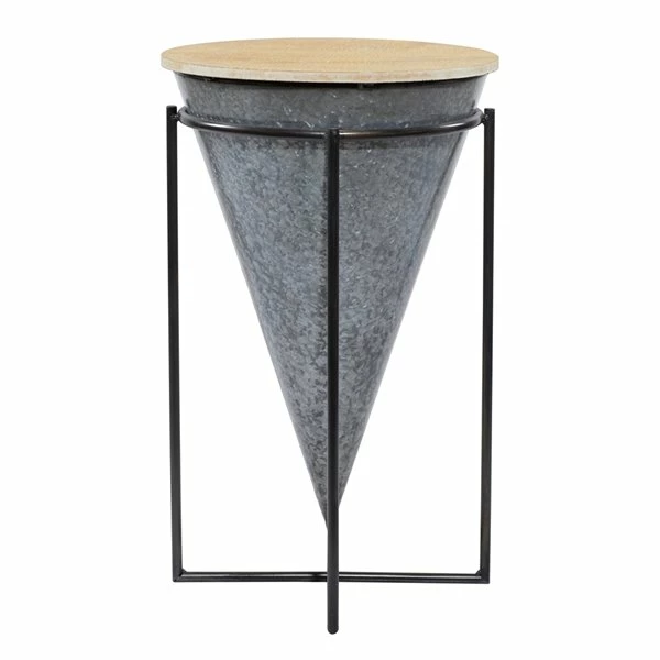 - This stunning metal drum table features a hammered grey iron finish, polished dark grey iron finish, and natural brown wooden finish