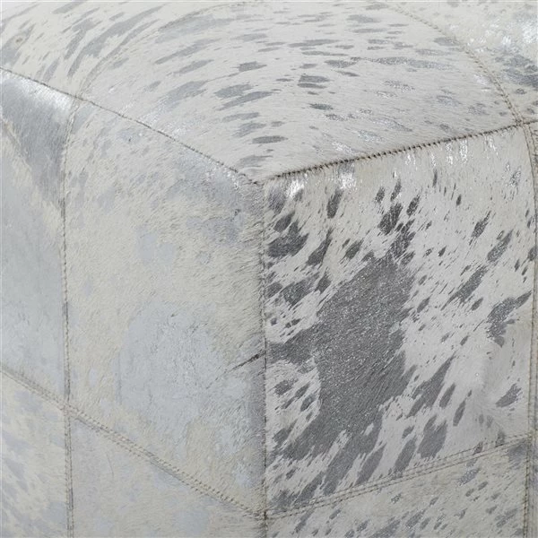 - Features a cube-shaped ottoman covered with natural leather hide