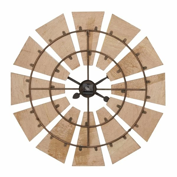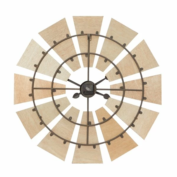 Hang this wooden wall clock over a couch or bed in a farmhouse-style room. Designed with a farmhouse inspired theme for an inviting and wholesome aesthetic.