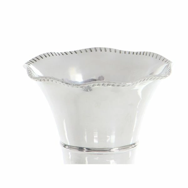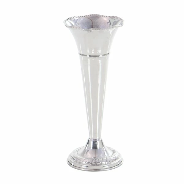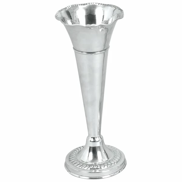 - Metal trumpet vase with a scalloped rim and a round base with decorative grooves