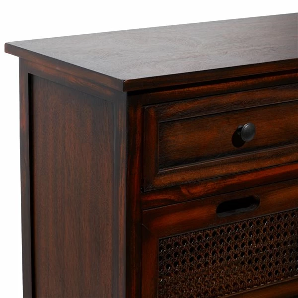 - Features a dark brown stained finish
