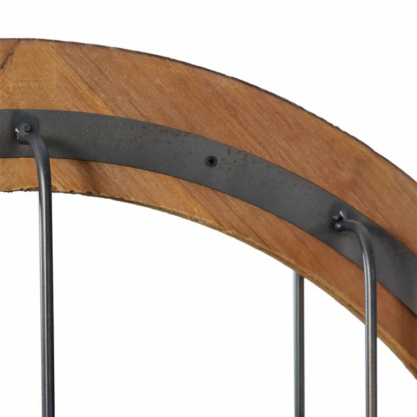 - It features a round wooden frame, clear reflective glass, and grid-patterned design