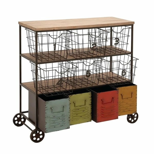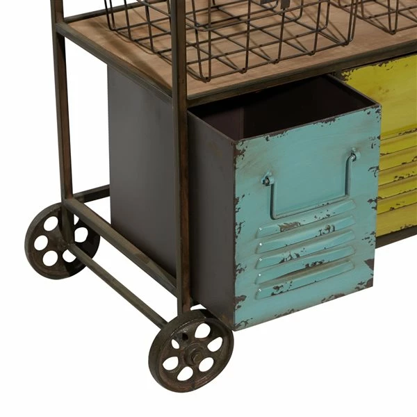- Features natural brown wood shelves, iron grid baskets, and louvred drawers painted in different colours, with a distressed finish