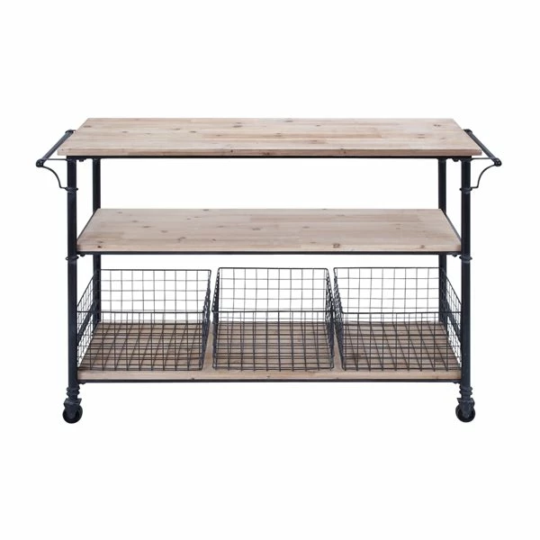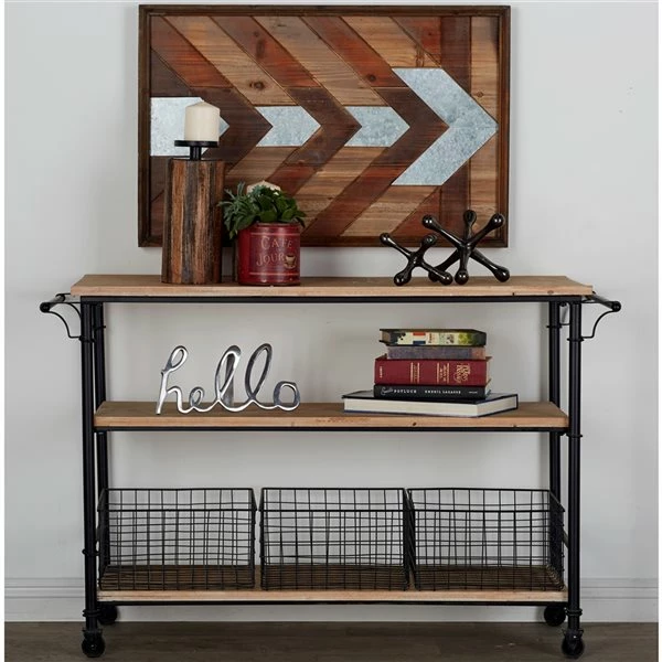 - Natural wood grain and light beige hue throughout the tabletop and shelves, dark silver textured iron frame
