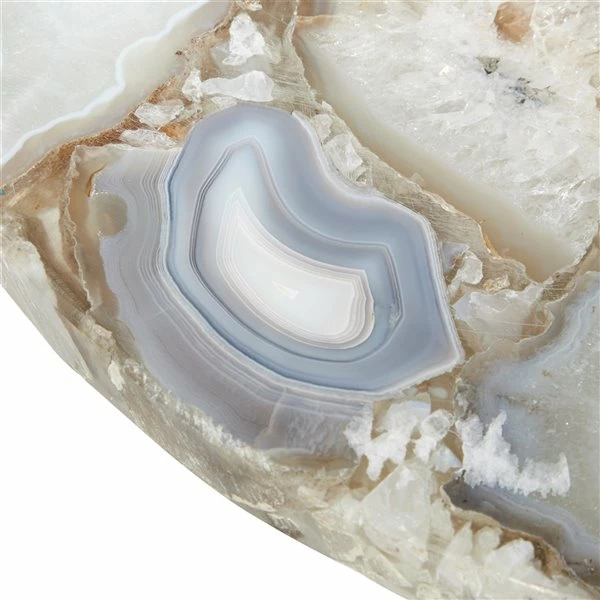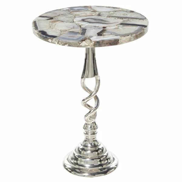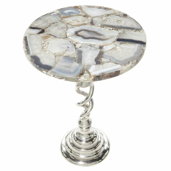 - This round metal accent table features a polished metallic silver finished leg and base and a unique multi-white hued table top