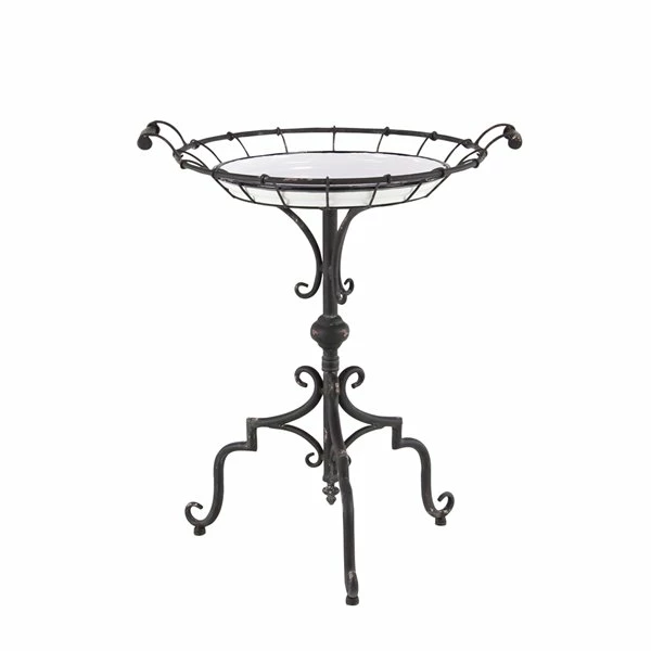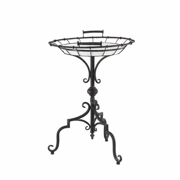 - Circular traditional accent table with wood tray and iron frame