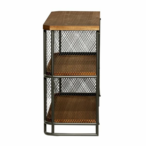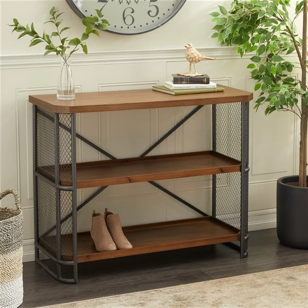 - Brown rectangular shelves with wood graining and metallic black crisscross-designed frames