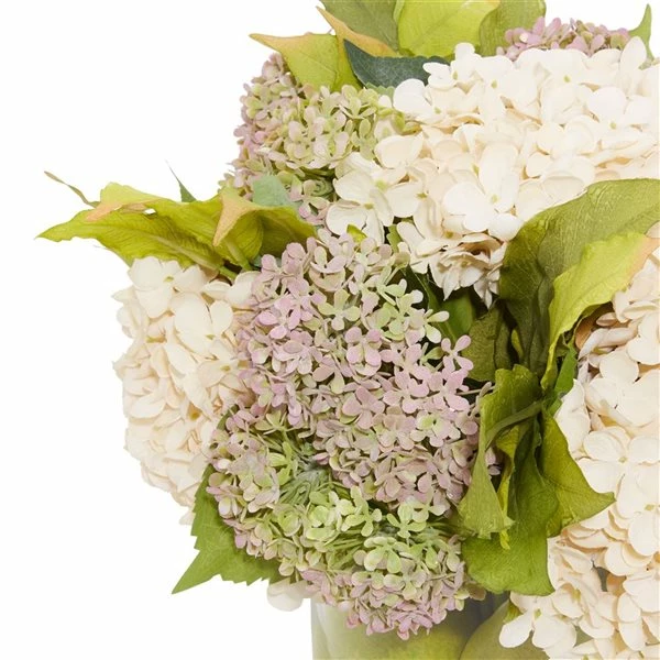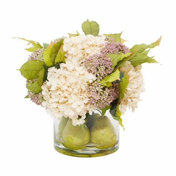 - Cream hydrangea, pink and green snowball hydrangea stem and leaves in glass vase with acrylic water and pears.