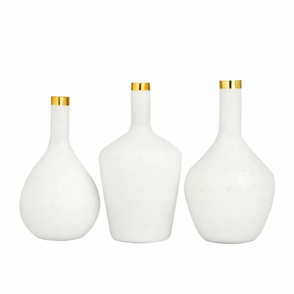- A set of 3 white glass vases featuring different body shapes with smooth coatings along with small mouth openings with gold rims