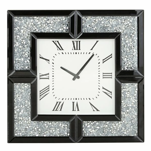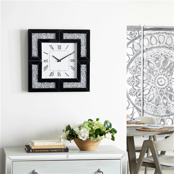 - Features a square-shaped clock with a thick frame and crystal embellishments