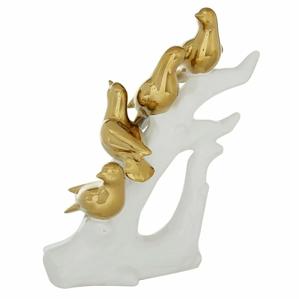 - A polished table decoration that comes with 4 gold birds resting on a white large branch serving as a stable base