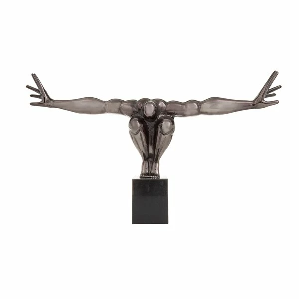 - This art deco sculpture feature an image of a man in a sitting position with his muscular arms and hands spread out like wings