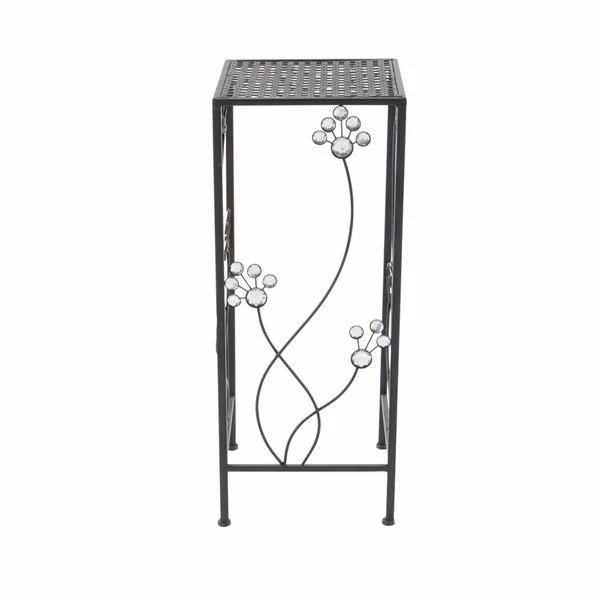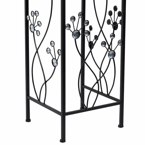- An open waffle grid top, rectangular shapes, and decorative iron vines with clear acrylic crystal flowers