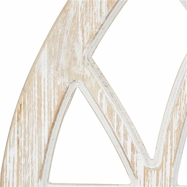 - Light beige wood with a whitewashed finish over the cathedral window-shaped frame